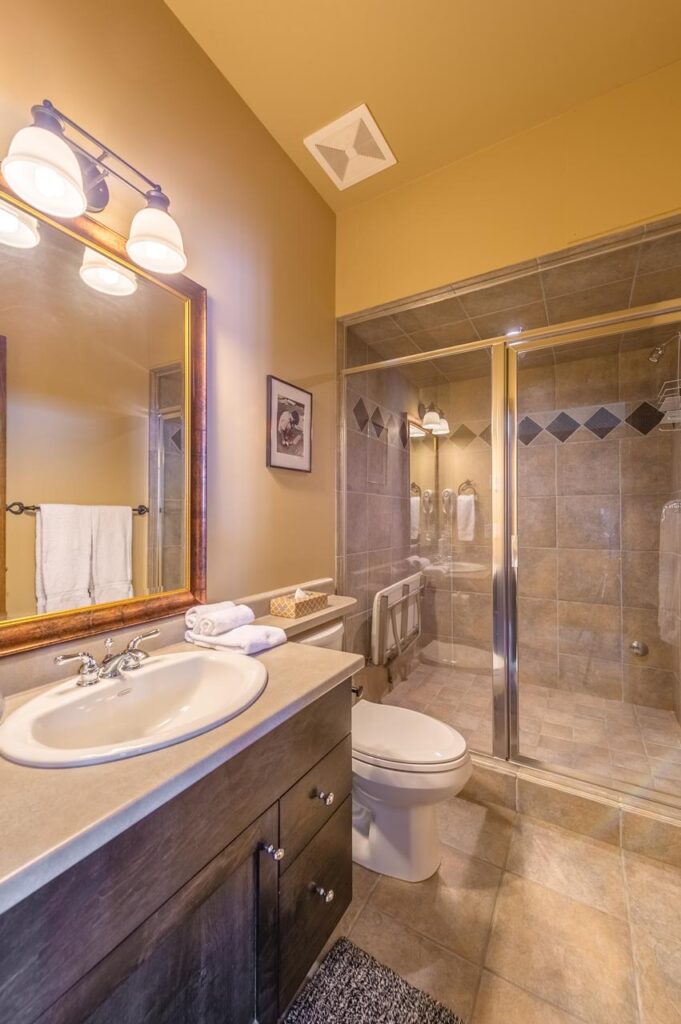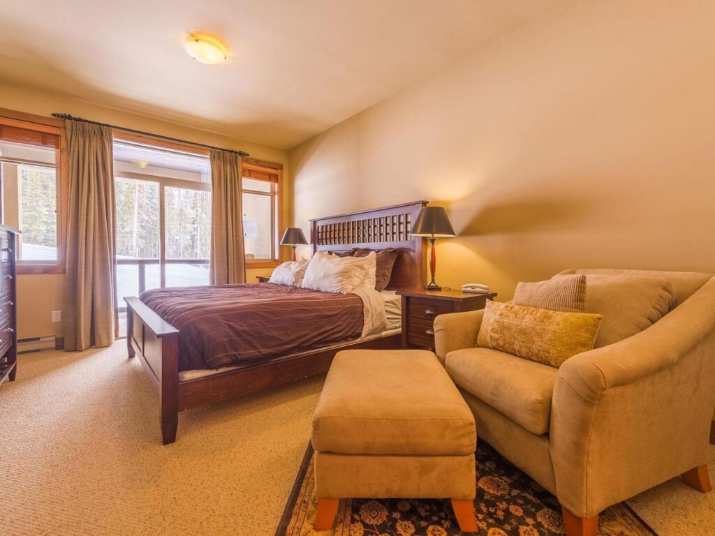 Upstairs, the main floor’s open-concept design seamlessly blends the kitchen, dining, and living areas, creating a warm and inviting space to gather. Large windows frame views of the ski run, while the gas fireplace and tasteful décor make this great room ideal for entertaining. A fully equipped gourmet kitchen and gas BBQ on the deck ensure you’ll have everything you need to prepare and enjoy meals together. The king master bedroom with its own ensuite is conveniently located just off the living room.