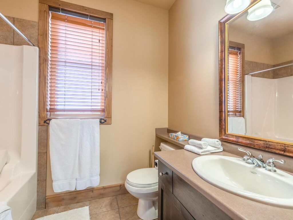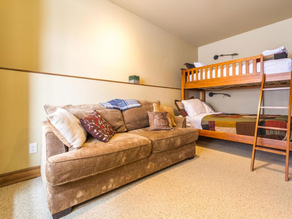 As you step inside, you’ll be greeted by a generous entranceway with heated slate flooring and plenty of storage for your winter gear. The entry level features a cozy queen bedroom, a fun bunk bedroom with its own TV and cable, a full bathroom, and laundry facilities. From here, you can also access the private deck with a 6-person hot tub — the perfect place to relax after a day on the slopes.