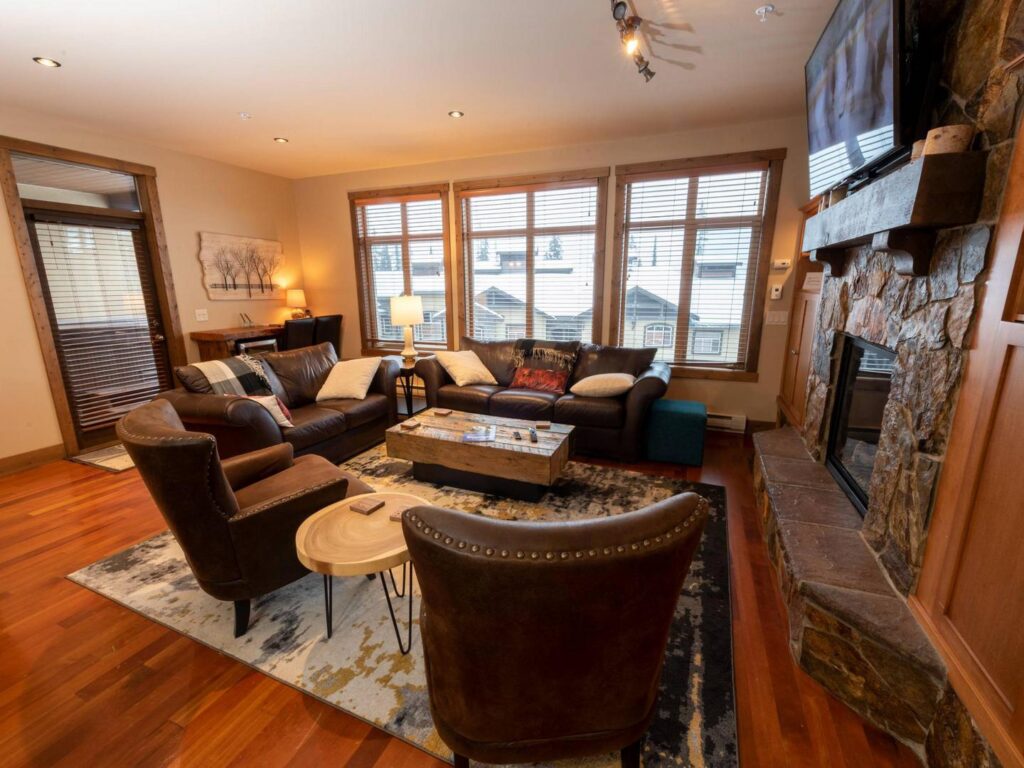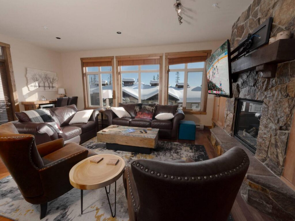 Welcome to your true ski-in/ski-out mountain retreat! Perfectly situated in Southpoint just above Happy Valley, this luxury home combines comfort, elegance, and convenience for the ultimate Big White experience. Step inside and you’ll find a dramatic open-concept living space, featuring Douglas fir flooring, maple shaker cabinetry, and a striking floor-to-ceiling rock fireplace. Large picture windows frame breathtaking views, while handsome leather furniture invites you to relax in style after a day on the slopes.