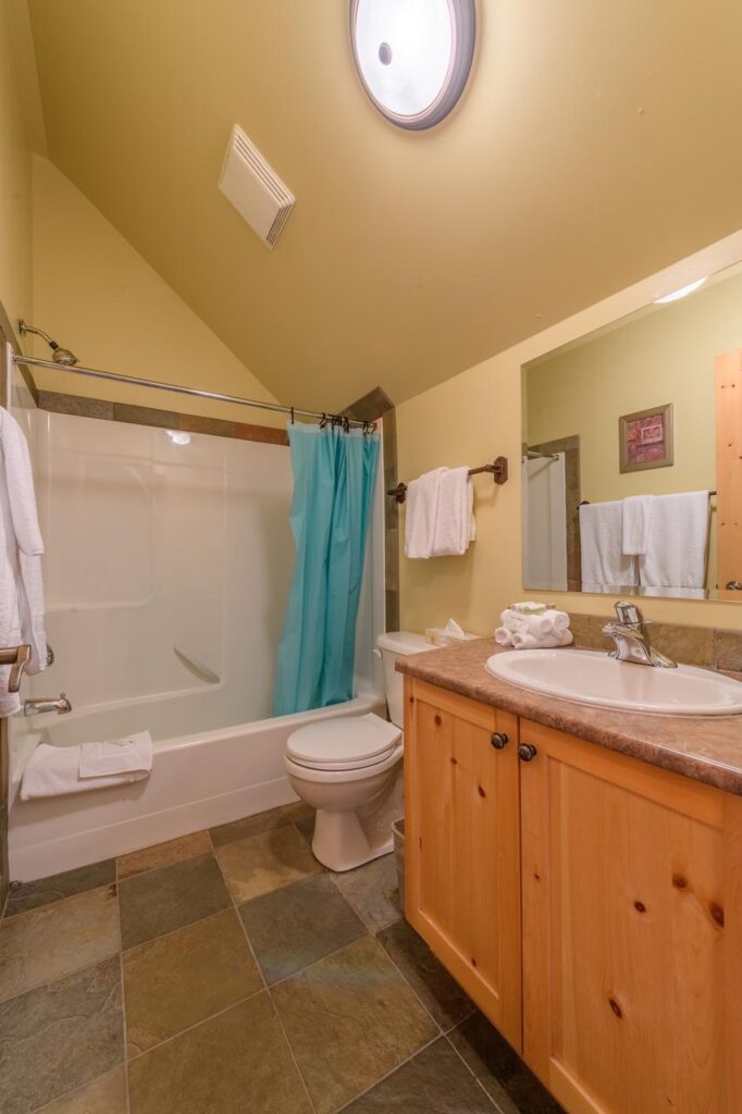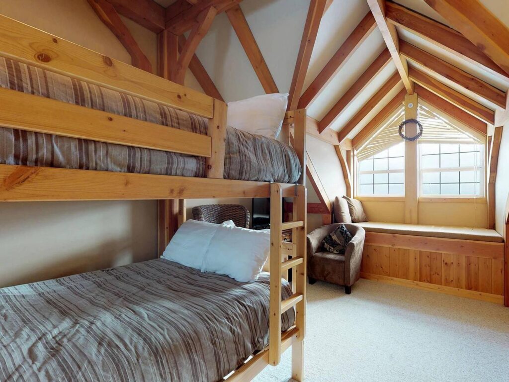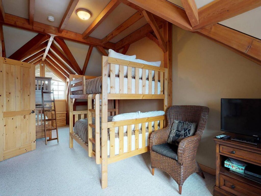 On the third floor, you’ll find two queen master bedrooms, each with its own ensuite bathroom and plush linens for a restful retreat. The top floor bunk room is ideal for families or kids, offering a double-over-double and single-over-single bunk setup.