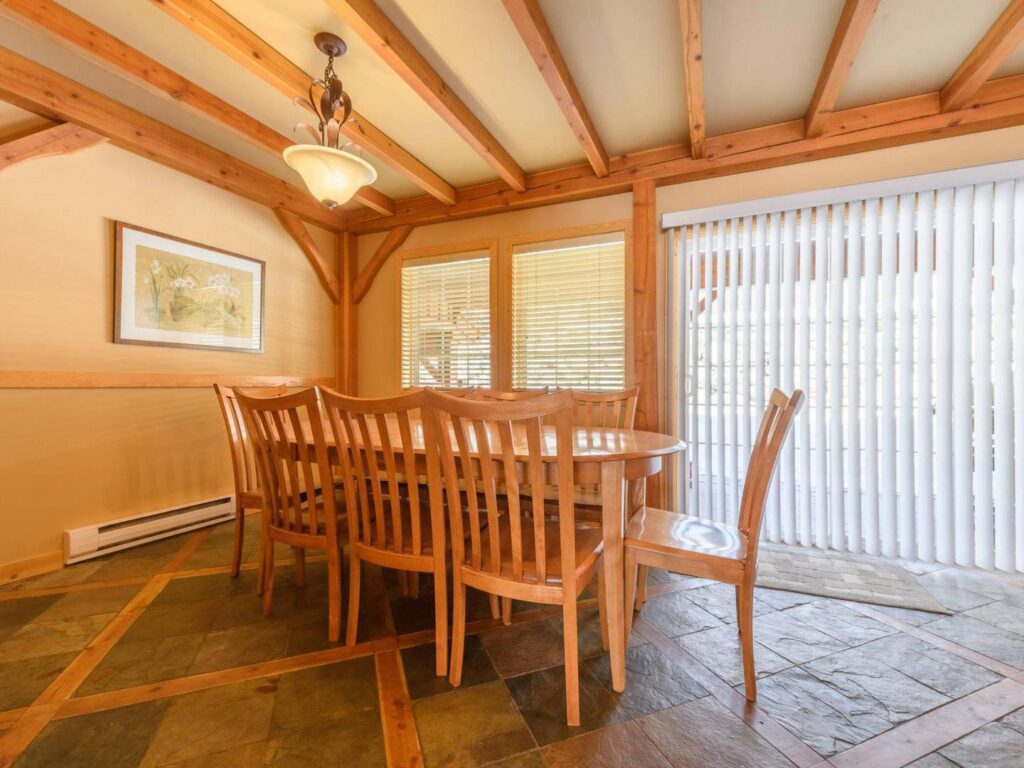 The open-concept kitchen and dining areas are thoughtfully designed for gathering, with a fully equipped gourmet kitchen and access to the north-facing deck complete with a BBQ for year-round grilling.