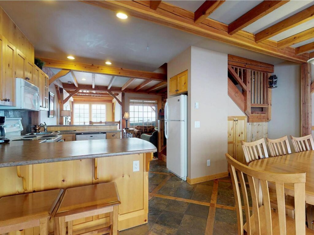The entry level provides plenty of space to store your gear after a full day on the slopes, with a half bath and laundry room for added convenience. Upstairs, the main entertaining floor is warm and inviting, featuring a cozy living room with two sofas, a gas fireplace, modern electronics, and a wall of windows that frame the surrounding alpine scenery. Step out onto the south-facing deck to unwind in your private six-person hot tub, where valley and mountain views stretch before you.
