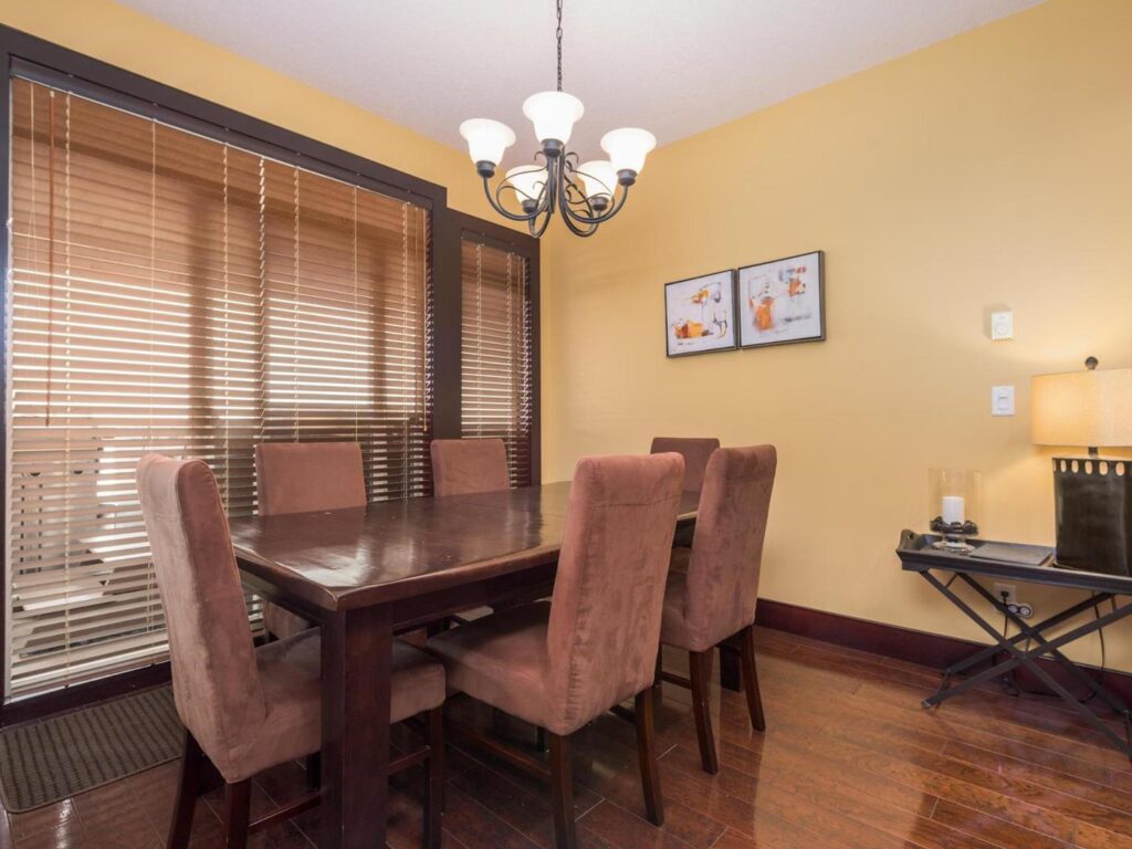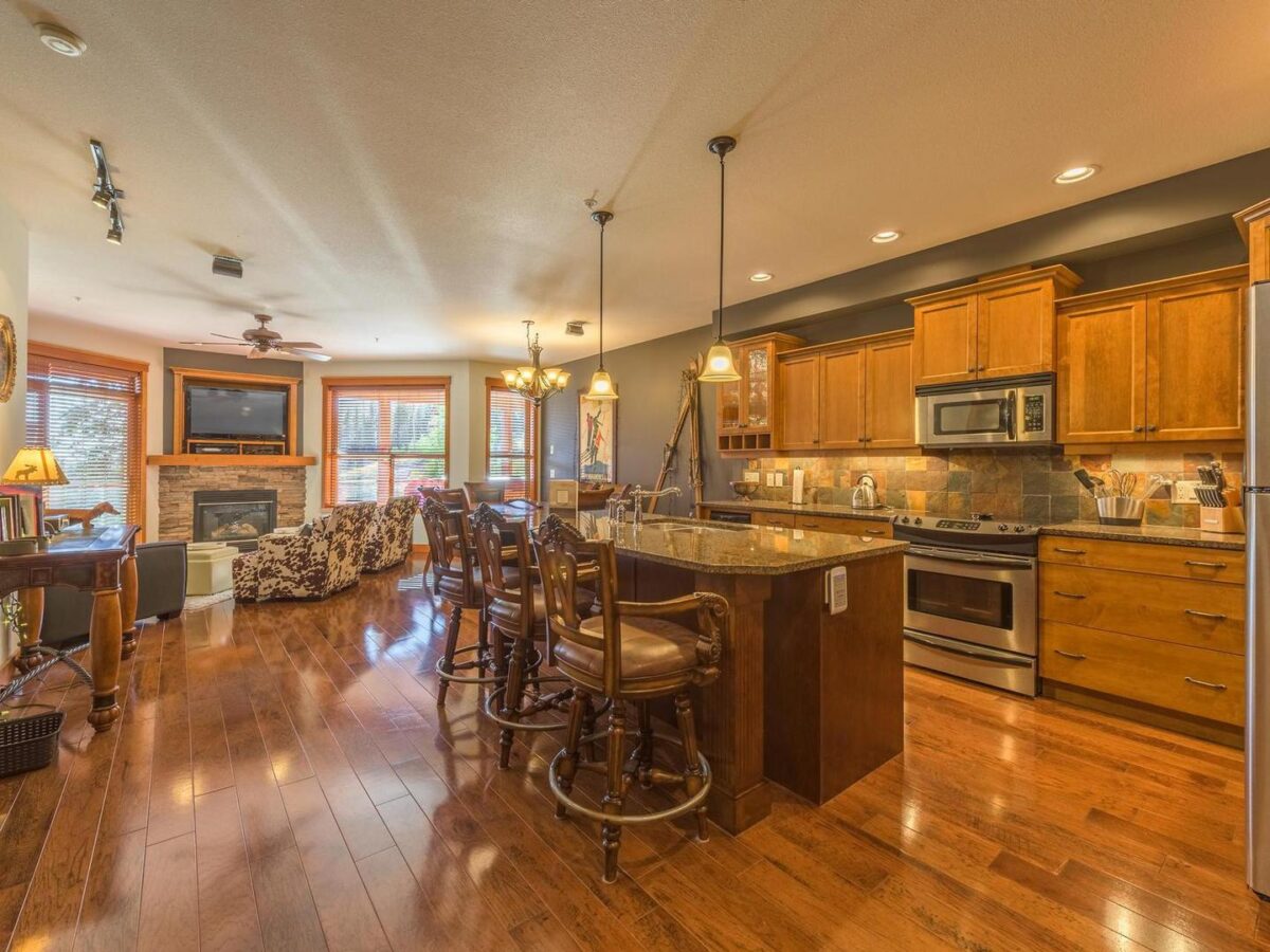 The cozy living room, complete with a gas fireplace, plush sofa, and comfortable chairs, makes an inviting spot to unwind after a day on the slopes. Settle in for a movie on the entertainment system, play board games, or simply enjoy each other’s company. Just steps away, the dining area offers a large table with seating for six, complemented by additional seating for three at the kitchen bar in oversized swivel chairs.