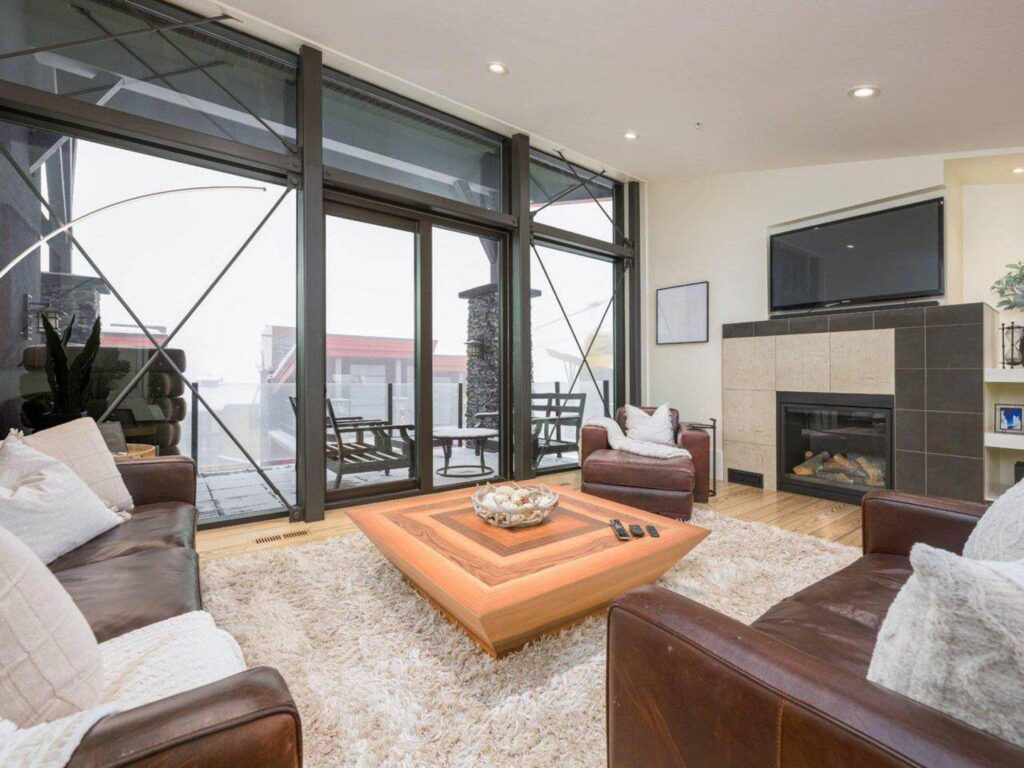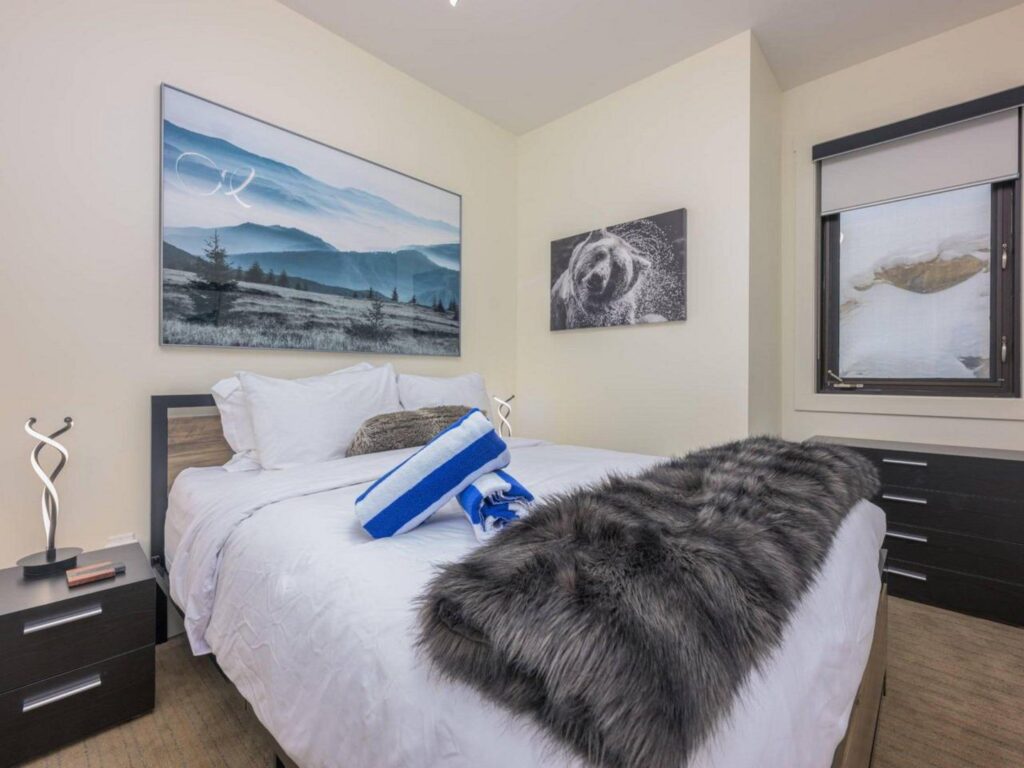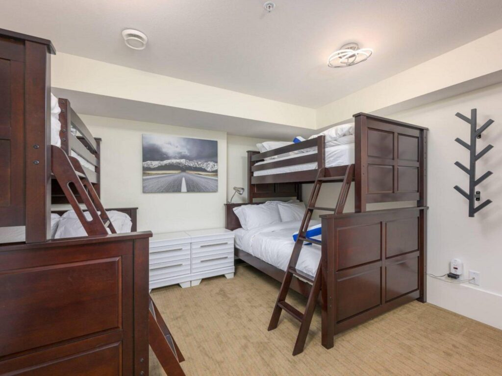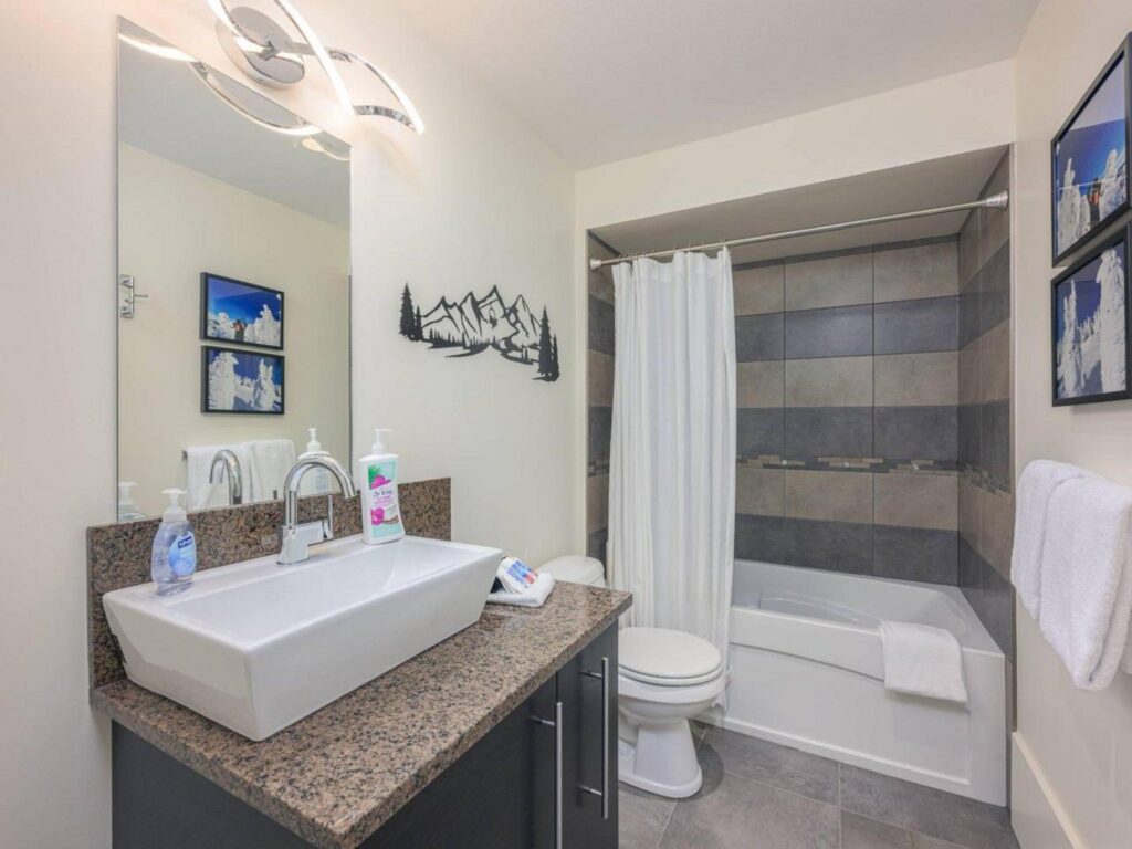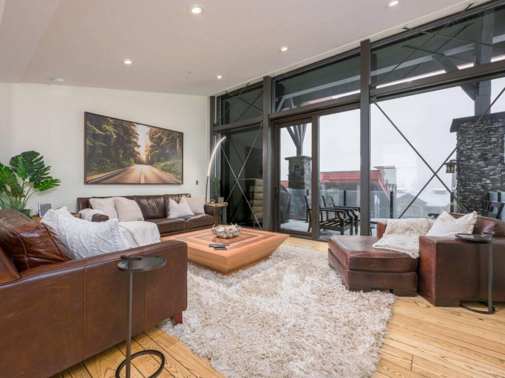 The contemporary alpine interior includes clean lines and comfortable spaces. With 3 full bedrooms, a large bunkroom for the kids and a spacious living room with soaring ceilings, there is plenty of space for you to entertain your friends and/or enjoy quiet family moments in a central location with easy access to all amenities. Soak up the views and sunshine from the 6-person hot-tub after a fun filled day on the slopes !