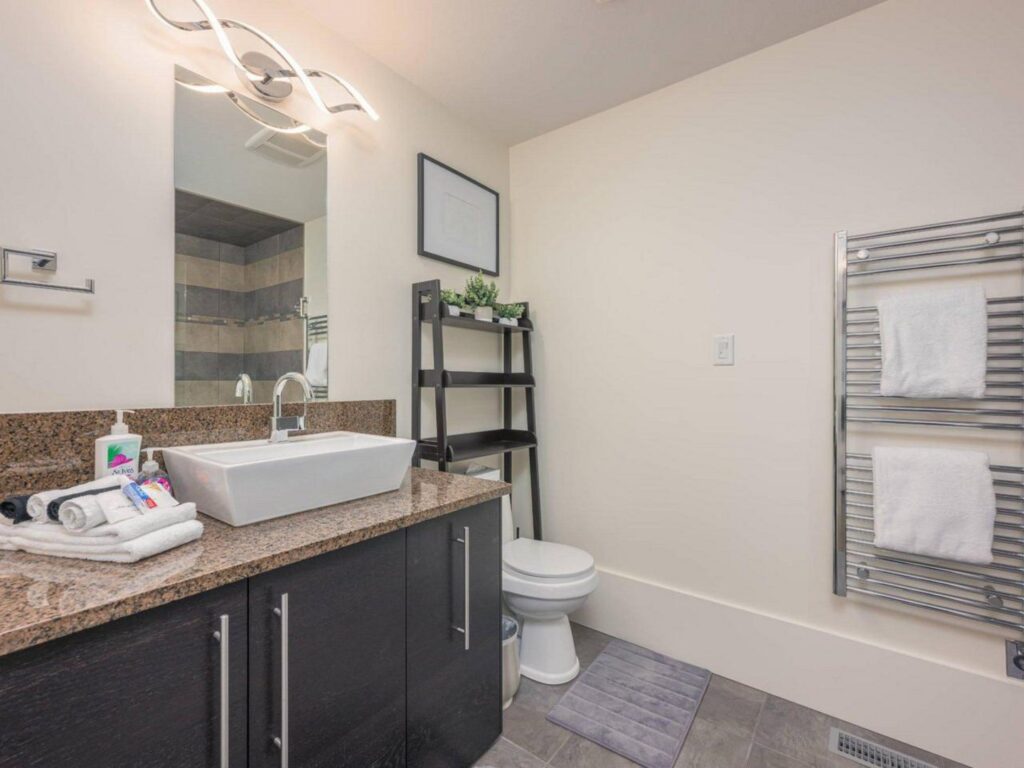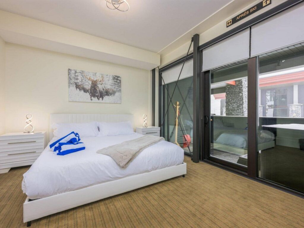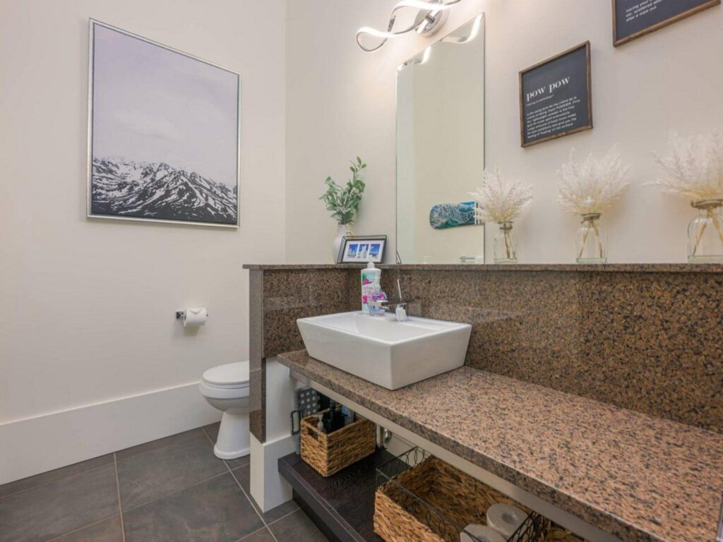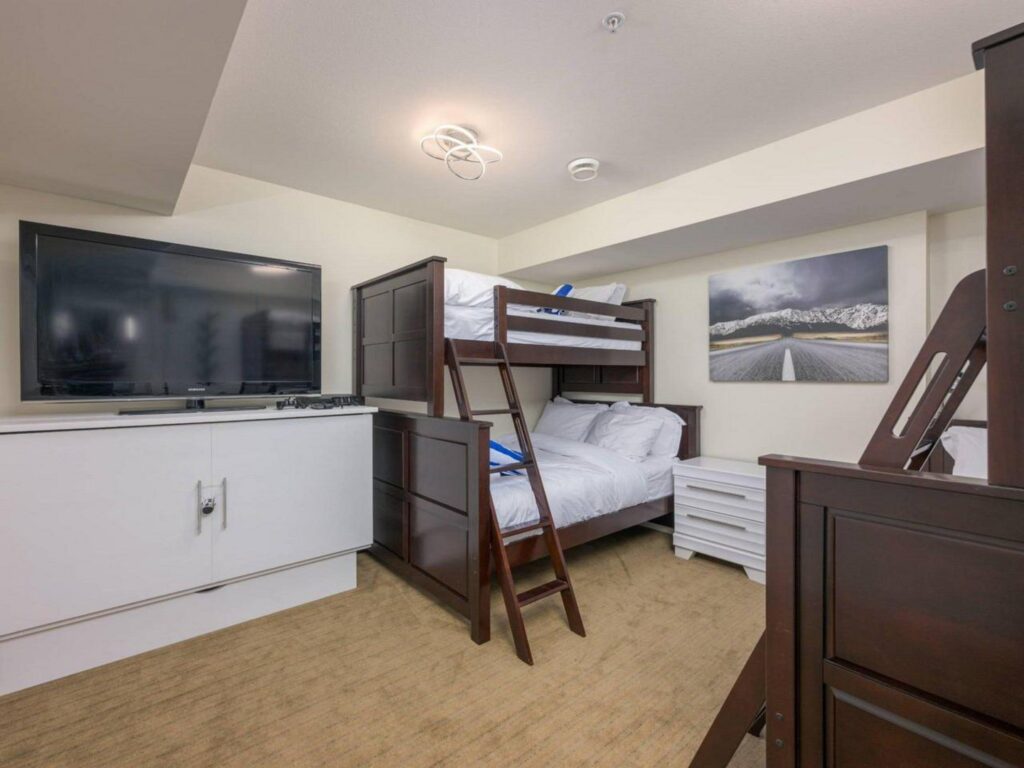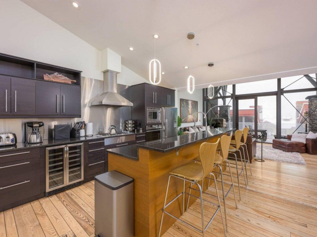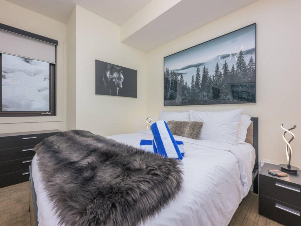 The contemporary alpine interior includes clean lines and comfortable spaces. With 3 full bedrooms, a large bunkroom for the kids and a spacious living room with soaring ceilings, there is plenty of space for you to entertain your friends and/or enjoy quiet family moments in a central location with easy access to all amenities. Soak up the views and sunshine from the 6-person hot-tub after a fun filled day on the slopes !