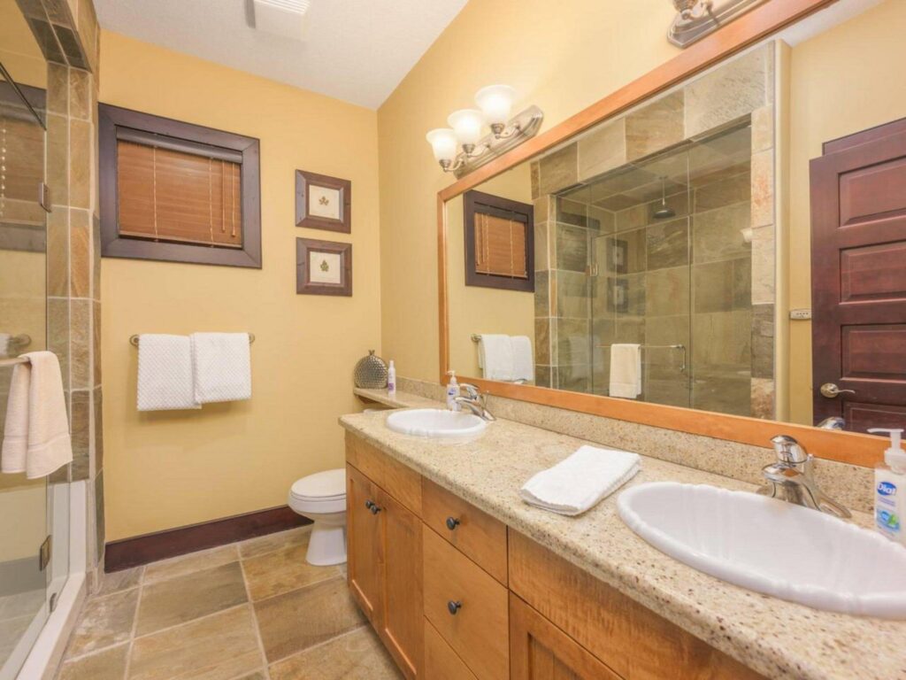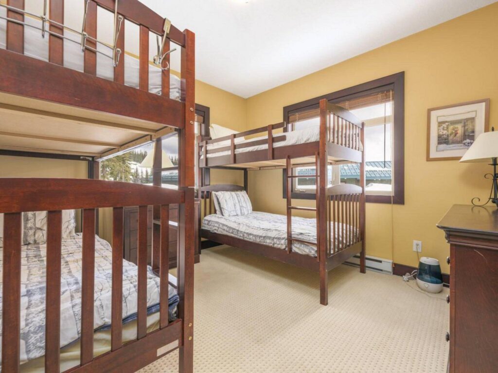 The main floor also hosts a luxurious primary queen bedroom, complete with a seating area, walk-in closet, and spa-inspired ensuite featuring heated floors and a steam shower. On the lower level, you’ll find two additional queen bedrooms, a fun bunk room with its own TV and gaming system, and a second primary queen suite with heated-floor ensuite. A shared bathroom and convenient laundry center are also located here, along with access to the private heated two-car garage and secure ski storage.